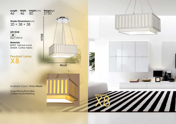 محصول x8 مسینا طراحی سری x گروه تولیدی مسینا می باشد که از طراحی مدرن و مینیمال با ساختاری از بدنه چوب طبیعی و شید کتان قابل شستشو تلفیق گرم و زیبایی را به نمایش می گذارد ، این لوستر دارای 4 شعله با سرپیج E27 سرپیچ پایه لامپ معمولی یا LED بهره می برد که هر خریداری با سلیقه خود می تواند از لامپهای متفاوتی در آن استفاده کند ، البته که استفاده از لامپهای آفتابی زیبایی این محصول را دو چندان می کند و به محل زندگی و کار شما گرمایی از جنس نور اضافه می کند ، شید تمام محصولات مسینا ضد آب بوده و از این رو میتوانید طبق دستور العمل شستشو نصب شده روی محصول شید محصولات را بشویید.