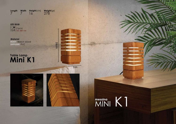 چراغهای رومیزی تنوع بالایی دارند و از آنها برای موارد مختلفی مانند تامین نور در حین مطالعه یا روشنکردن محیط در هنگام شب استفاده میشود. در انتخاب این چراغها باید به مدل میز و همخوانی ساختار چراغ با آن توجه داشته باشید. اگر ترجیح میدهید از دکورهای چوبی استفاده کنید، محصول فوق انتخاب مناسبی برای شما خواهد بود. این چراغ رومیزی را شرکت مسینا تولید میکند و آن را با نام «Mini K1» به بازار عرضه کرده است. این محصول برای تامین نور خود از یک لامپ کوچک سوزنی با پایهی G4 برخوردار است. این نوع لامپها باتوجه به توان مصرفی و سایزی که دارند، نمیتوانند نوردهی زیادی داشته باشند؛ ازاینرو این چراغ بیشتر جنبهی تزیینی و نورپردازی دارد. این چراغ وزن بسیار کمی داشته و این ویژگی بهلطف ساختار چوبی است که شرکت مسینا برای آن در نظر گرفته است. ارتفاع این چراغ رومیزی 16 سانتیمتر است.